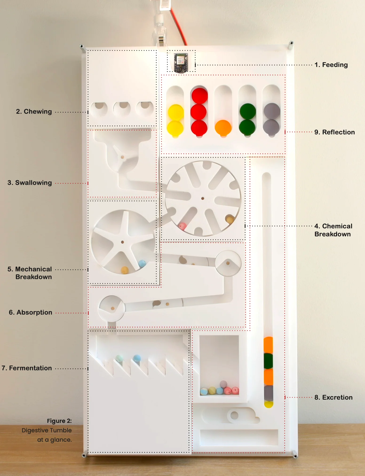 Digestive Tumble contributes to the field of Human-Computer Interaction (HCI) by introducing a tangible and personal approach to body learning. It pioneers the visualization of internal digestive processes, opening new avenues for interactive models of complex systems.