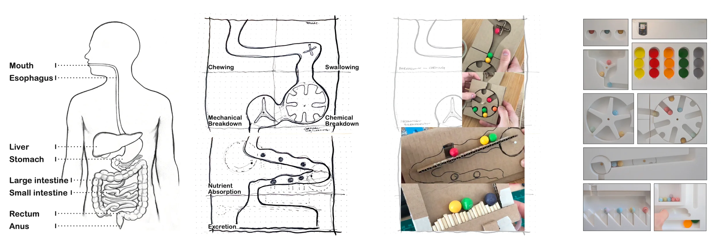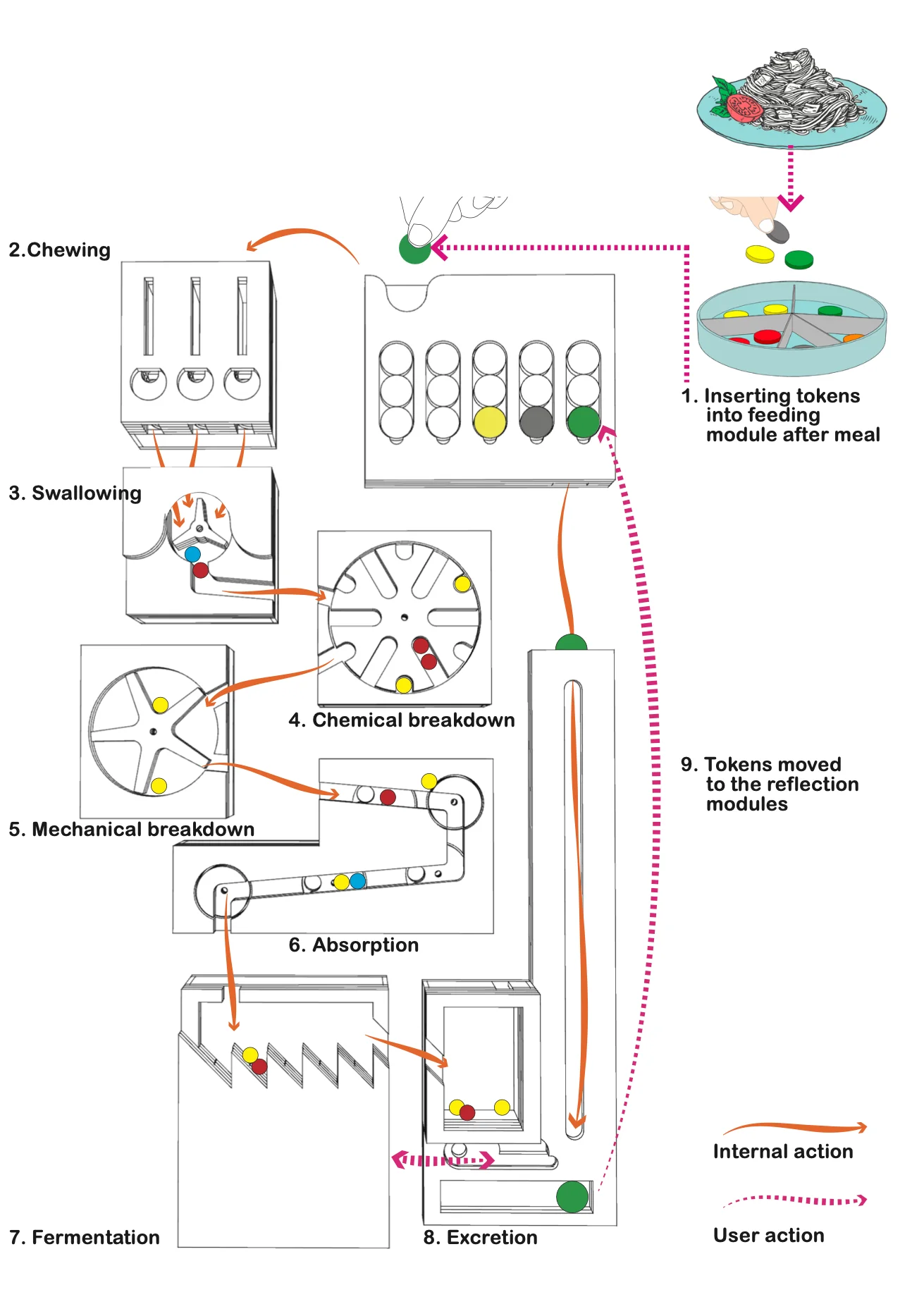 Digestive Tumble takes inspiration from the analogy of the body as a factory, with organs as machines. Recognizing the need for simplicity, the system presents a visually engaging yet straightforward representation of the digestive processes. Abstraction becomes a powerful tool, allowing users to easily comprehend and engage with the complexities of digestion.
