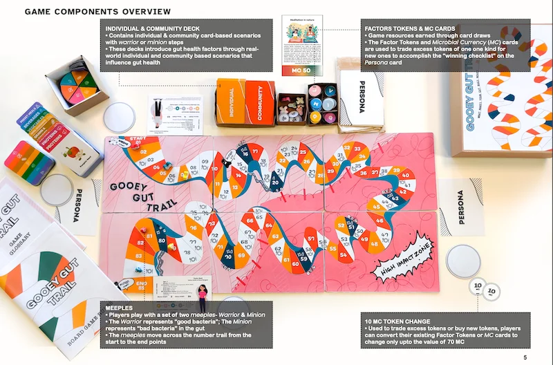 GGT transcends the confines of dietary considerations, shining a spotlight on a comprehensive array of factors influencing gut health. Employing card decks, meeples, factor tokens, and a game board, GGT ingeniously simulates real-world scenarios and activities impacting gut bacteria. Leveraging design fiction, the game unfolds as a relatable and reflective space for understanding gut health.