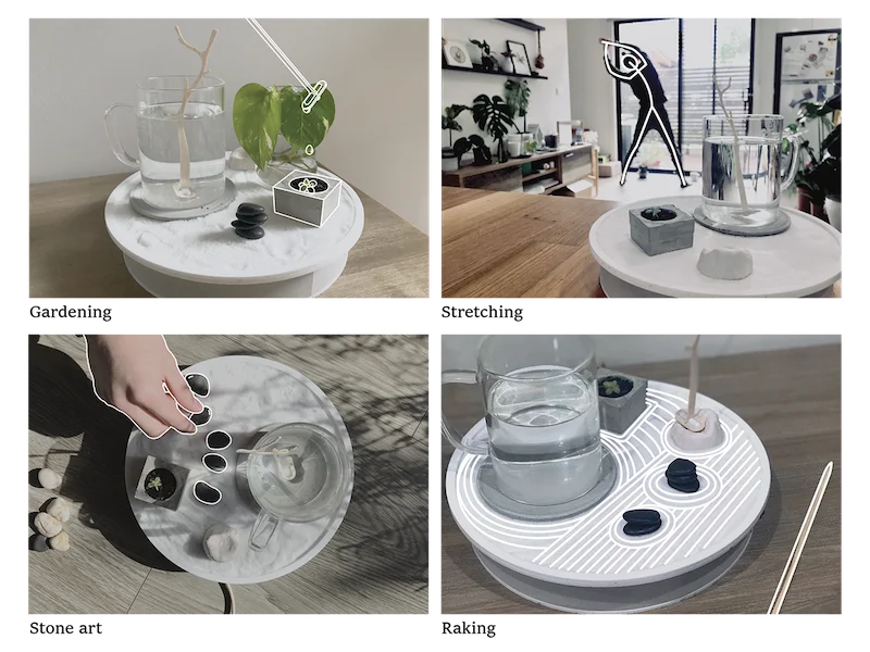 The field evaluation uncovered substantial positive outcomes. Users reported a newfound motivation to engage in regular microbreaks, resulting in an overall enhancement of well-being and productivity. The visual allure and incorporation of natural elements like sand and stones resonated particularly well, delivering a nostalgic and calming experience. Zenscape's physicality injected discipline into participants' work-break routines.