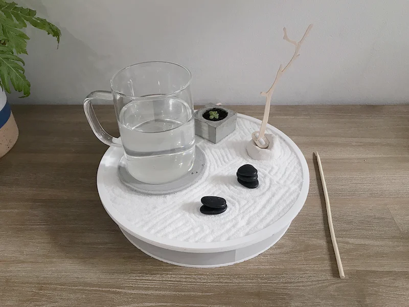Inspired by the profound Zen Garden, a practice deeply rooted in meditation, we curated elements of white sand, stones, and water to craft a miniaturized Zen Garden for the workspace. The open-ended activities within, like raking the sand and arranging stones, offer a canvas for creativity during microbreaks, devoid of set rules yet laden with the therapeutic release of stress. Zenscape encapsulates the Zen principles of naturalness, simplicity, and austerity. It artfully incorporates metaphors of still and moving water, mirroring the yin and yang of work and leisure. The still water signifies stability and reflection, while the stirring water, initiated at the user's set intervals, beckons movement and introspection, catalyzing the inner resolution of work-related stress.