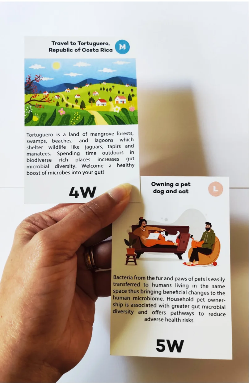 GGT transcends the confines of dietary considerations, shining a spotlight on a comprehensive array of factors influencing gut health. Employing card decks, meeples, factor tokens, and a game board, GGT ingeniously simulates real-world scenarios and activities impacting gut bacteria. Leveraging design fiction, the game unfolds as a relatable and reflective space for understanding gut health.